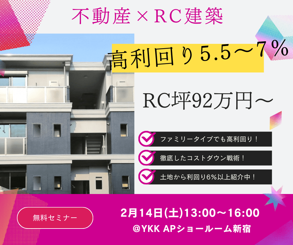 しかし、本セミナーでご紹介するのは、建築会社とWin-Winの関係を築き、建築会社の倒産リスクを回避しつつ、同時にローコストも無理なく安全に実現できる、そんな新築一棟RC共同住宅です。